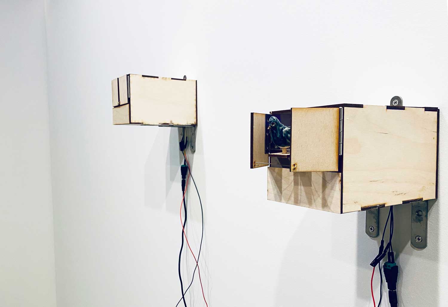 Eunsun Choi’s cacophonous installation of cuckoo “clocks” amplifies feelings of discomfort and anxiety. The timepieces, once symbols of status in South Korean households after the 1997 Asian Financial Crisis, carry echoes of her upbringing—tinged with nostalgia and complexity. Ceramic birds unpredictably burst forth from their makeshift homes, each emitting a distinct Korean onomatopoeia “puckuck!” call, mirroring and magnifying today’s prevailing sense of unease.